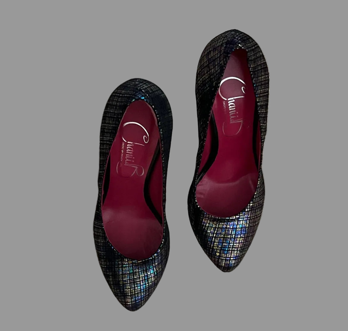 An elegant evening shoe with beautiful metallic leather finish. This pointed toe court shoe will easily compliment an array of colours as the metallic finish picks up on a whole spectrum of colours.
