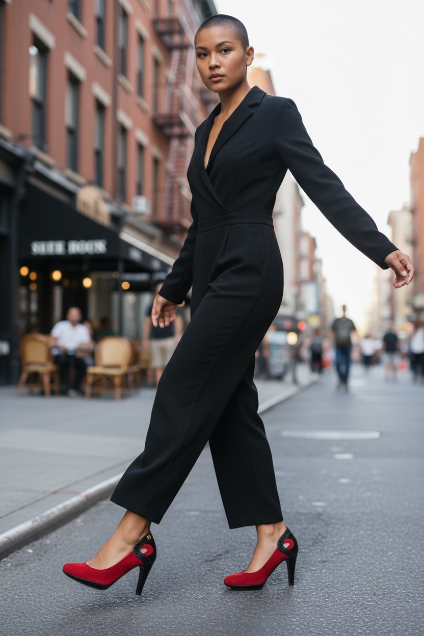 Red suede court shoe has many quirky little details to make this pump/court a statement like; painted heel, black detailed leather edging, and cut-out detailing.