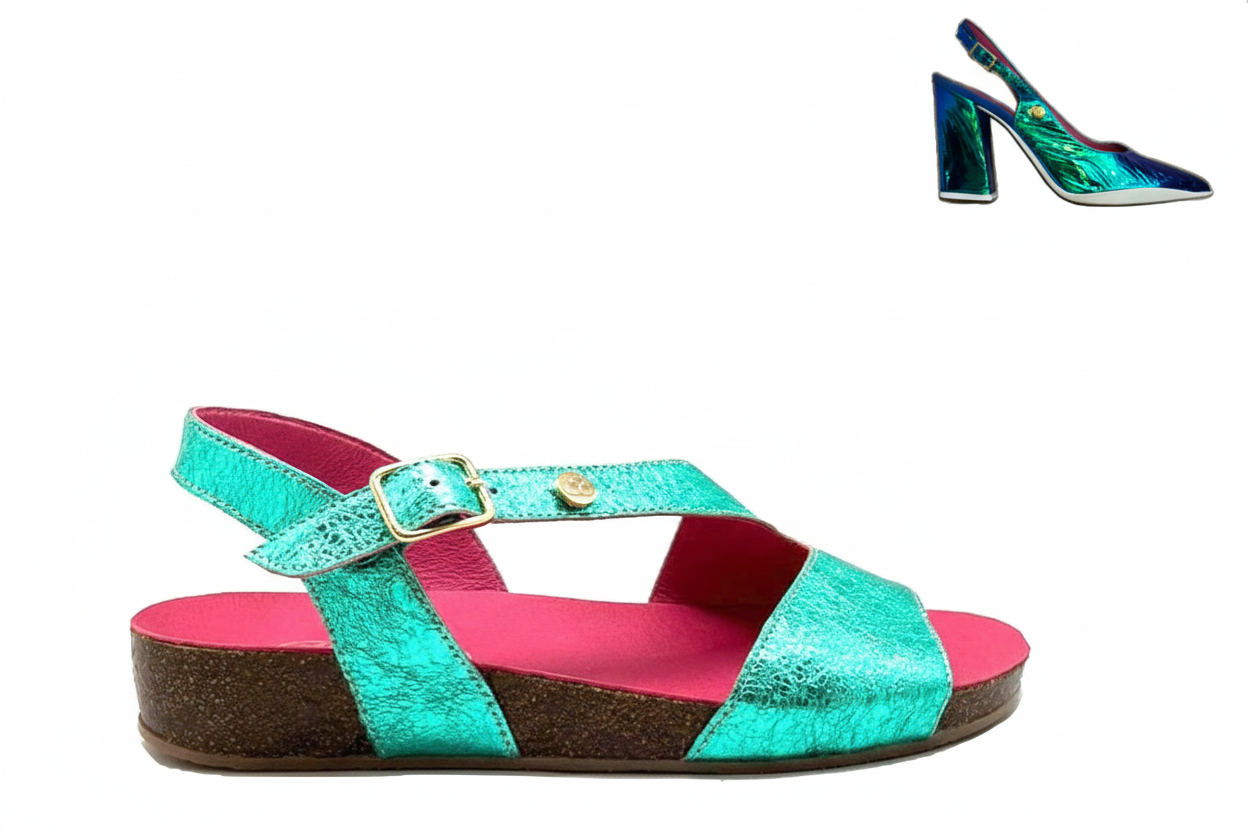New Blue foil as requested by many flat cork walking sandal- our premium leather collection
