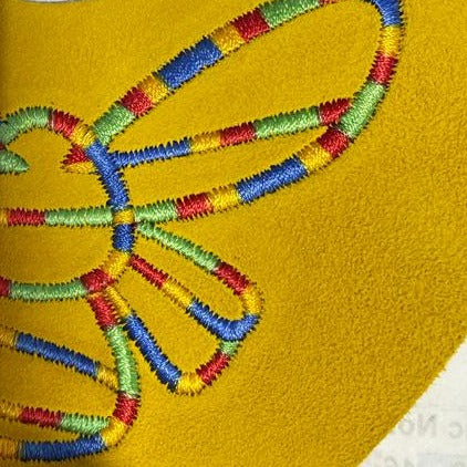 Gorgeous yellow ballerina adorned with a supple rubber sole, multicolored embroidered bee design, that adds a vivacious and delightful flair to each summery day.