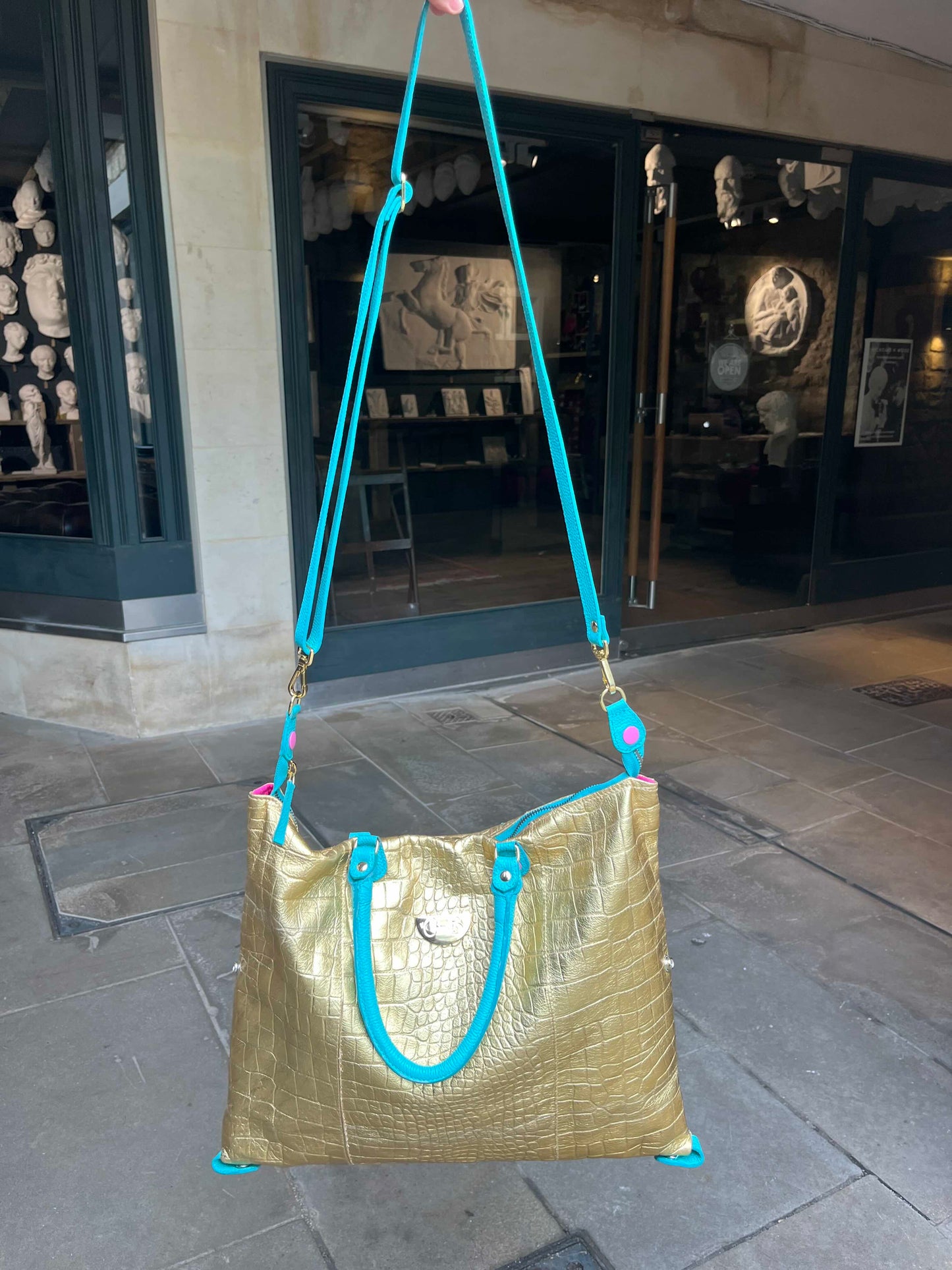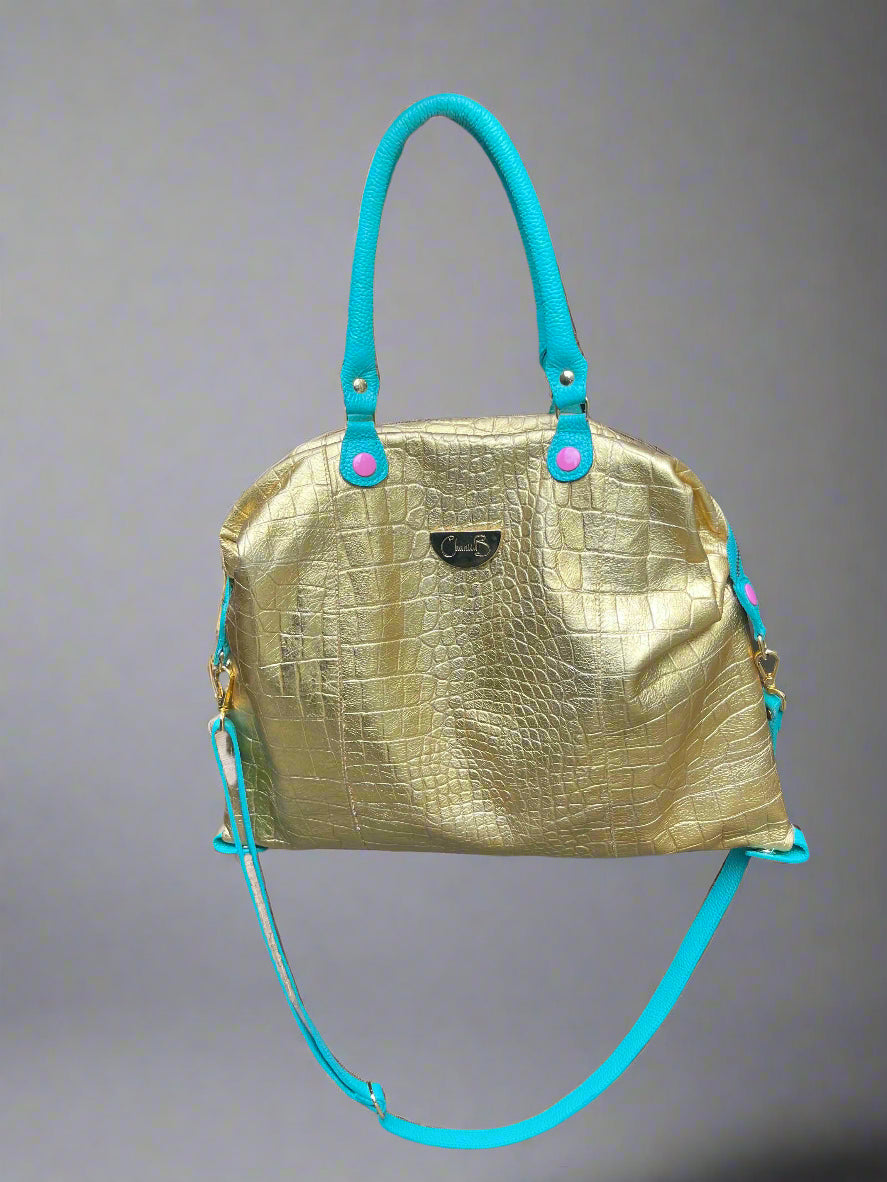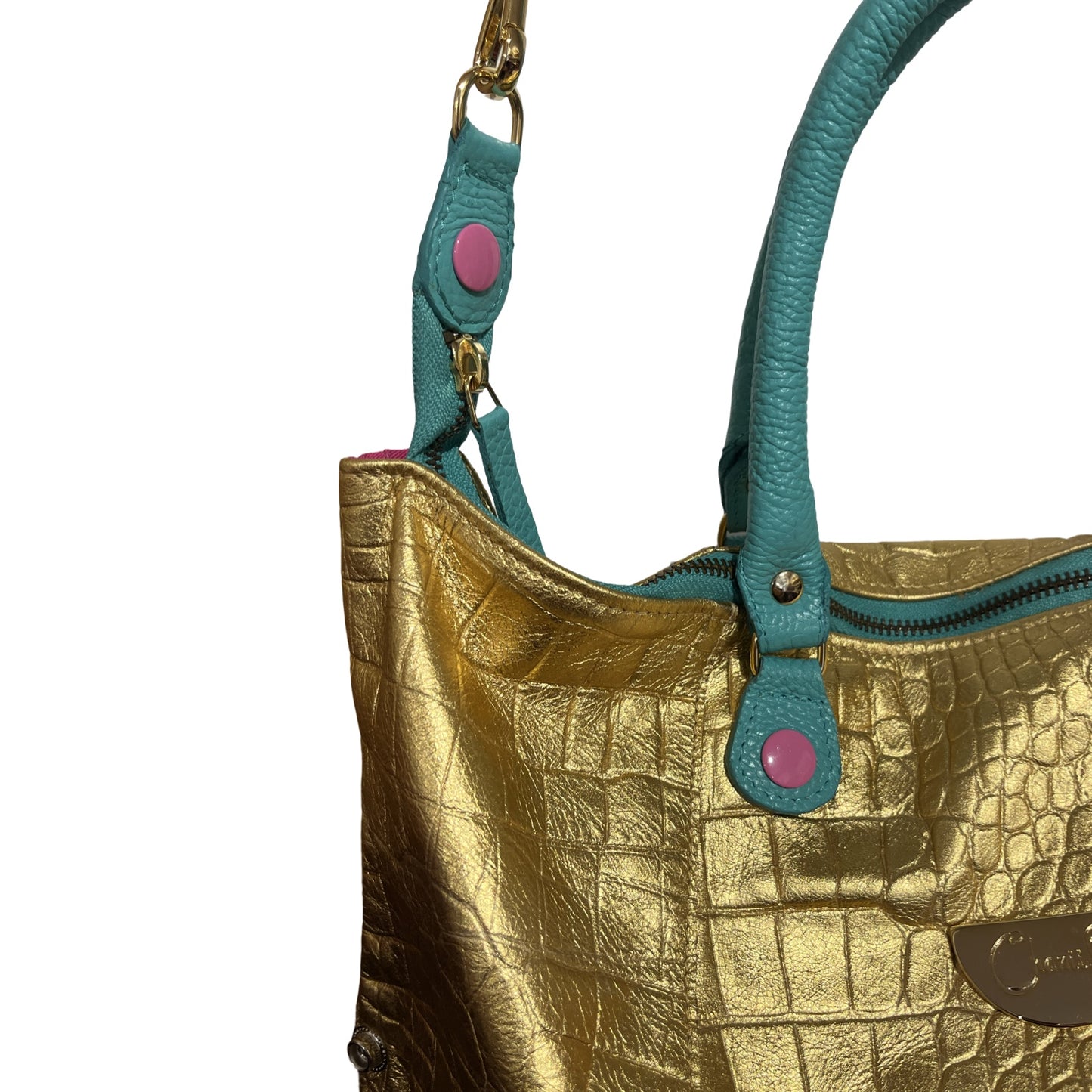 Luxurious medium sized gold leather handbag with exquisite textured leather and turquoise with pink buttons!