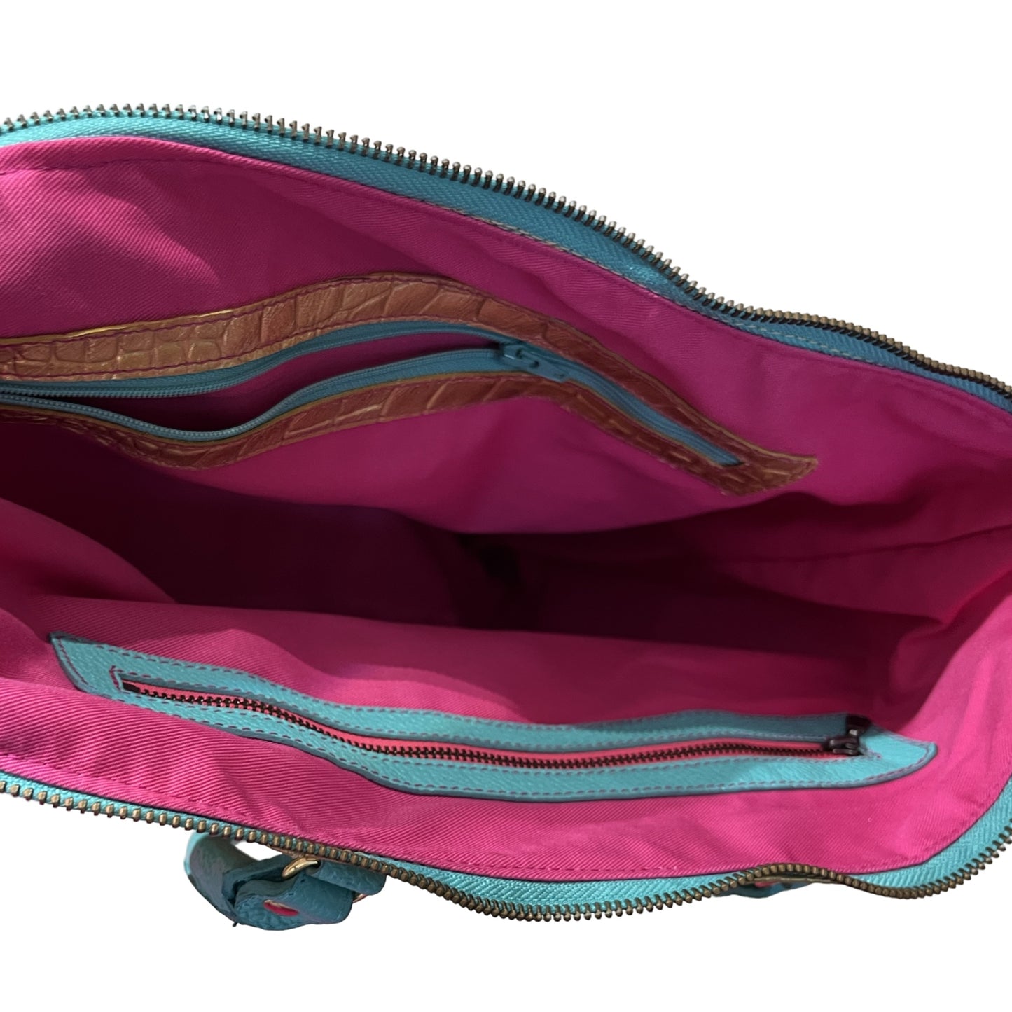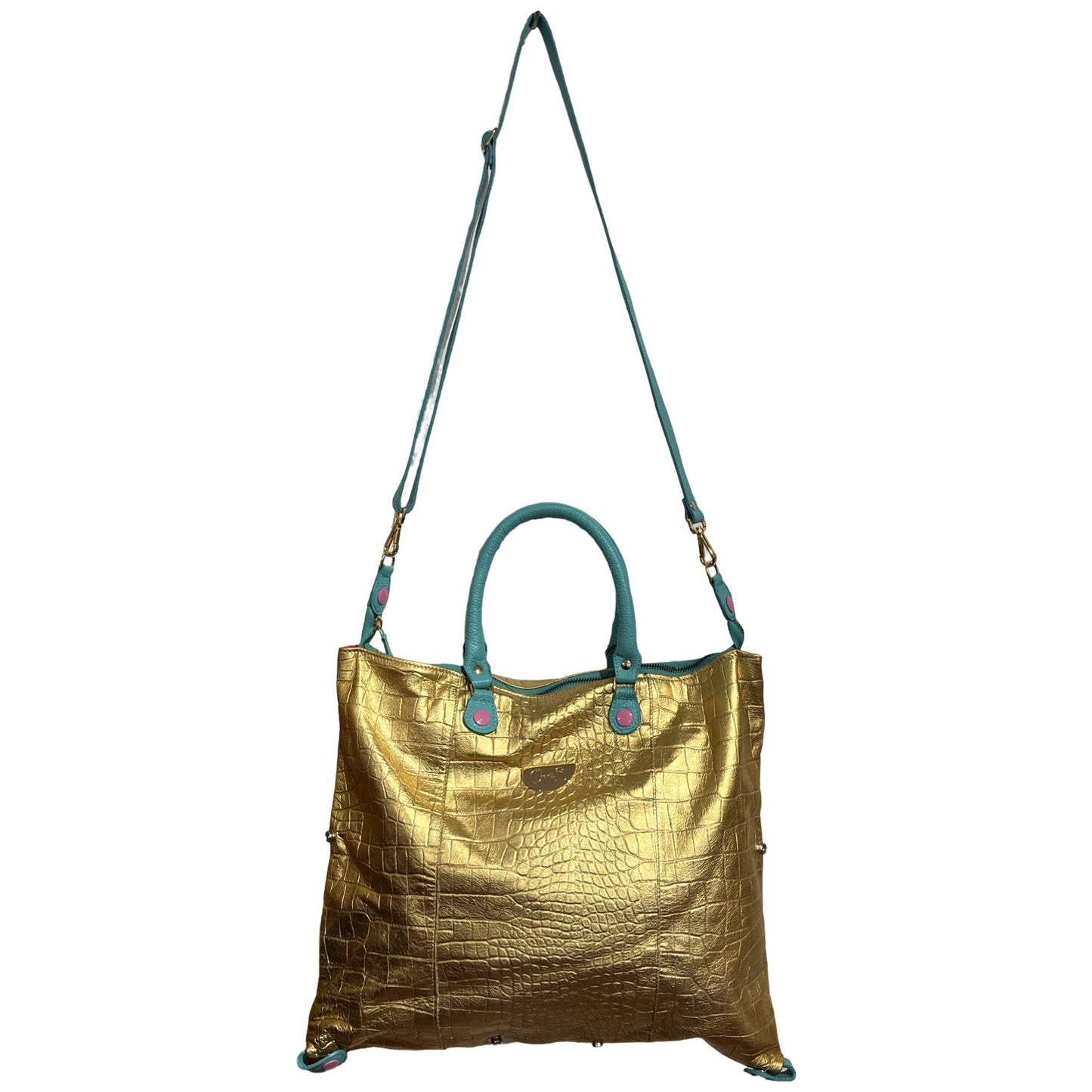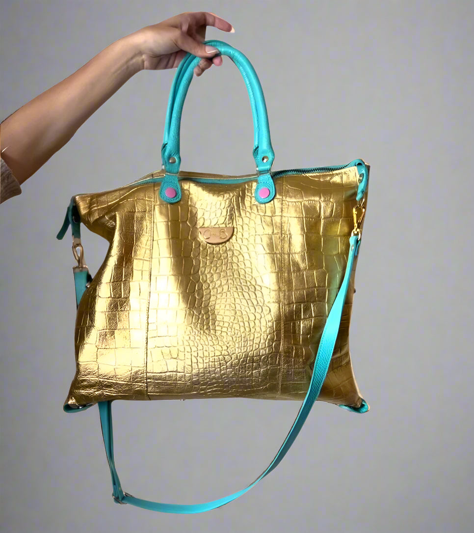 Luxurious medium sized gold leather handbag with exquisite textured leather and turquoise with pink buttons!