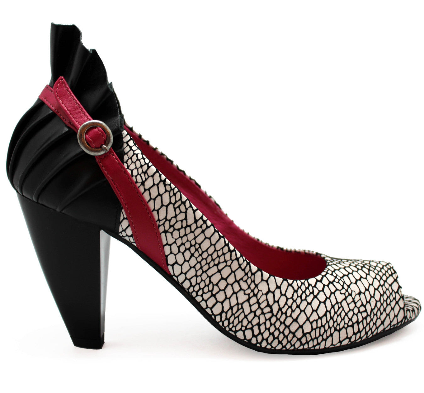 Crafted Rosert black and white leather, this sandal is given a striking touch with the inclusion of a bold fuchsia hue. The elevated heel ensures a glamorous lift, with a metallic paintwork and fan ruffle detailing adding a 'wow' factor. Exuding a luxurious air and set atop a flexible rubber sole, this exquisite shoe is certain to turn heads. Imbuing 8.5cm (3.3”) of fashionable flair, you'll be sure to stand out from the crowd.