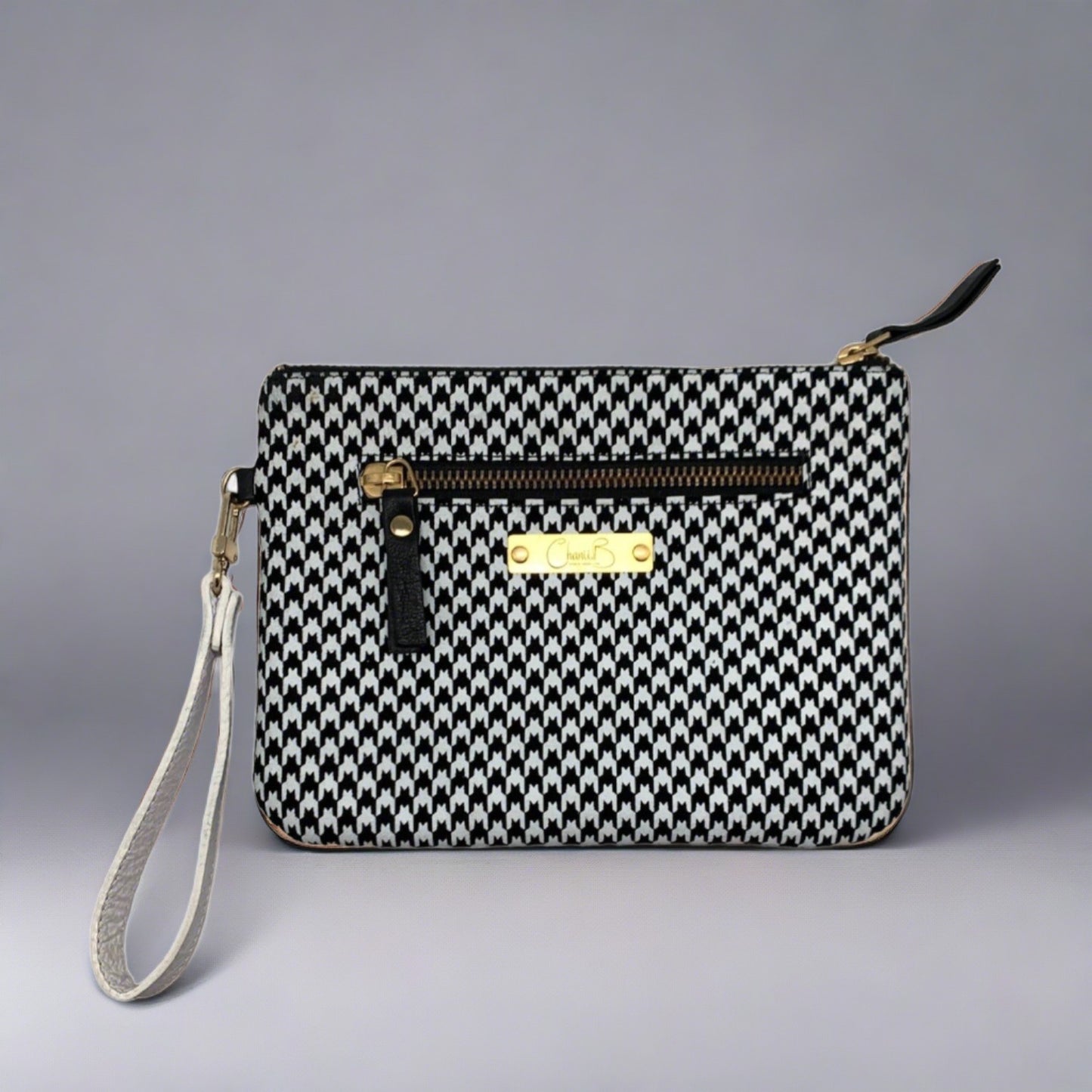 Luxurious zipper houndstooth leather clutch bag. This beautiful bag has a wrist strap so you don't always have to hold on to it. The clutch has two zipper closures to keep all your valuables safe and organised, along with the gold Chanii B badge. Perfect for your party and as a bag organiser.