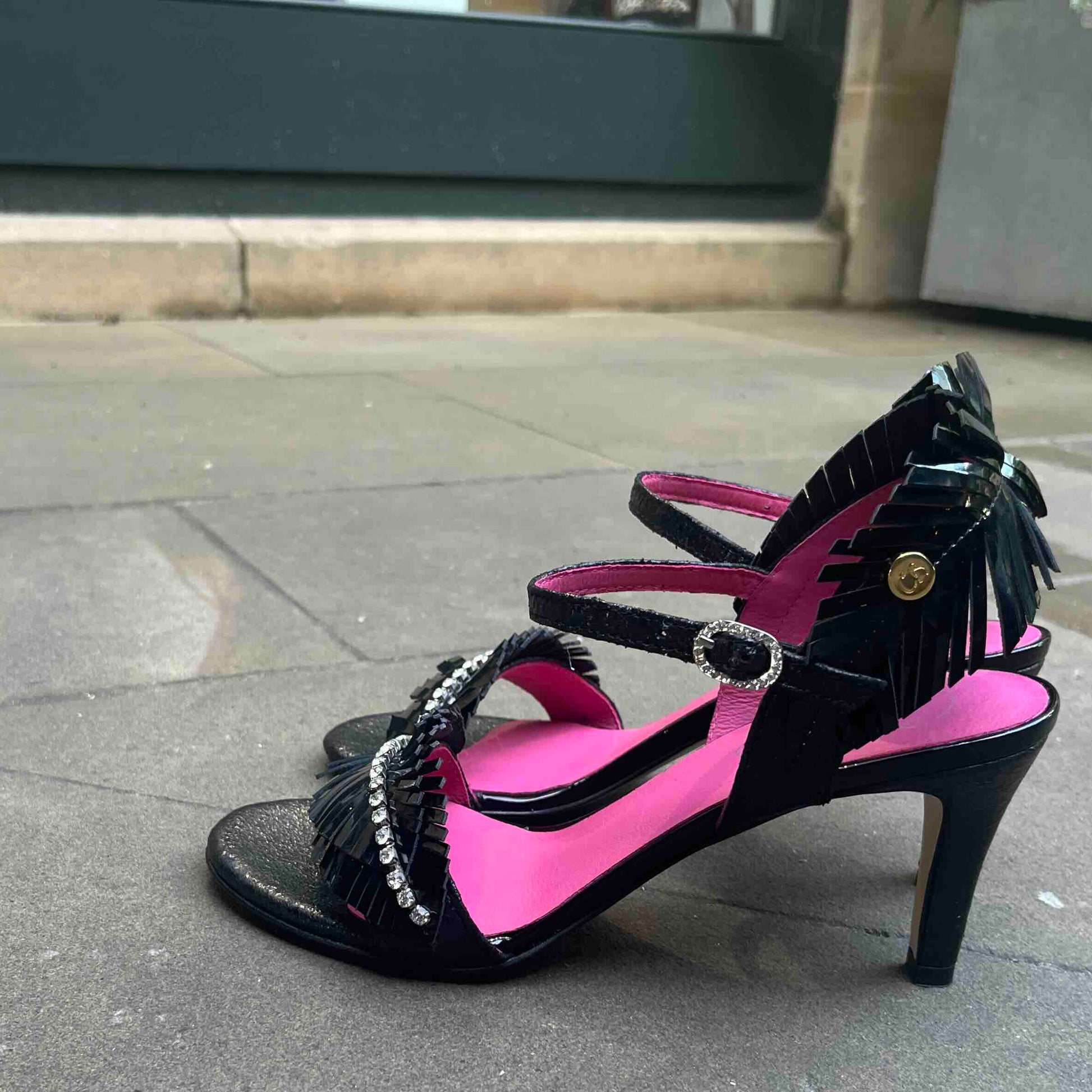 Black leather evening shoe crafted with an eye-catching design, this golden ankle-strap sandal boasts a luxuriously delicate leather-sliced feather adornment on its front and back. Boasting a sparkly diamonté strip, this splendid sandal is the ideal flair for those joyful festivities this season - a look not to be overlooked.
