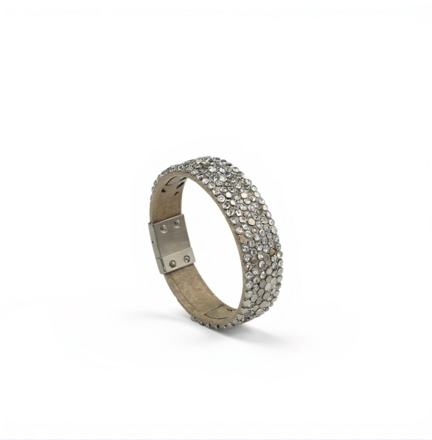 Artisanal leather bracelet adorned with a lustrous cascade of Swarovski crystals, each piece individually crafted to showcase the natural beauty of premium cowhide. A distinctive accessory that merges refined craftsmanship with timeless elegance.