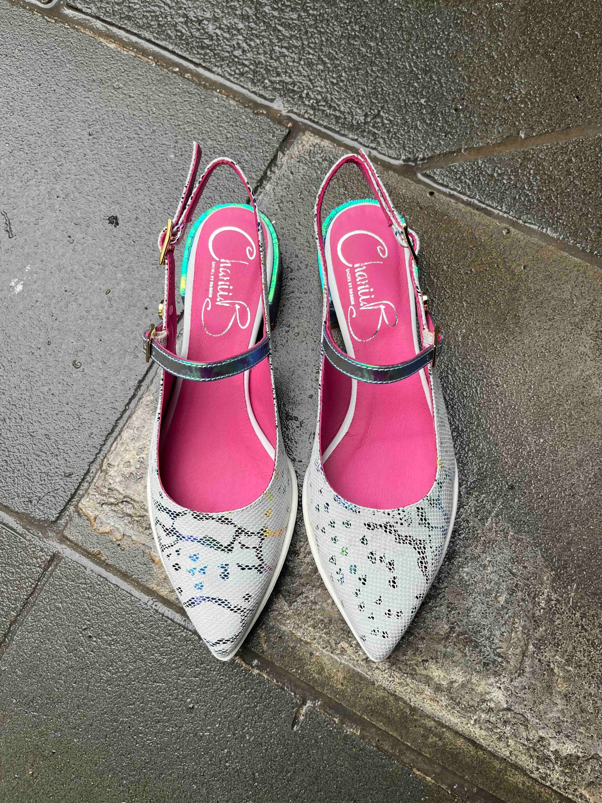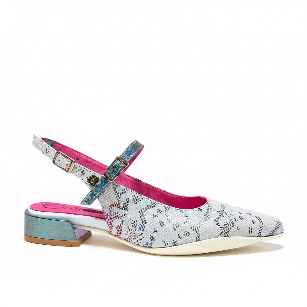 Welcome our luxurious Pirot- white multi print leather, crafted with the same construction as our iconic Pierre and Lala designs. Made of soft leather and accented with pink foil leather these shoes exude sophistication and exclusivity.