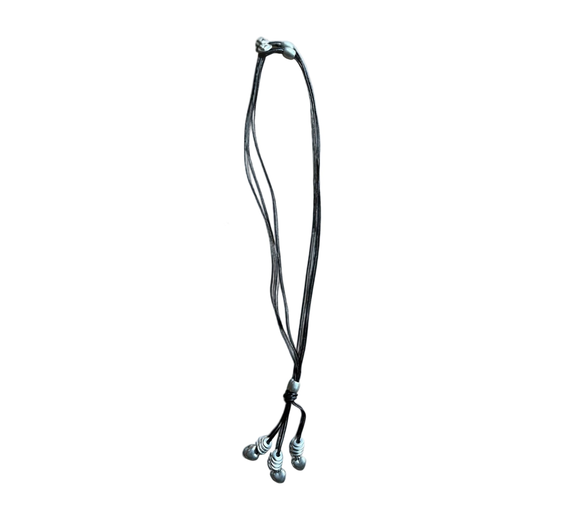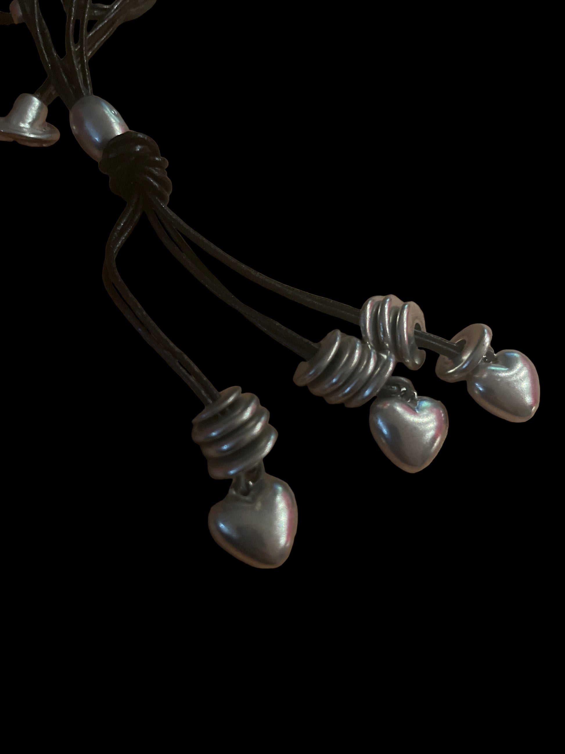 Expertly crafted with sleek black leather straps accented by shiny silver discs and charming hearts, this unique necklace exudes a sense of edginess with a touch of femininity.