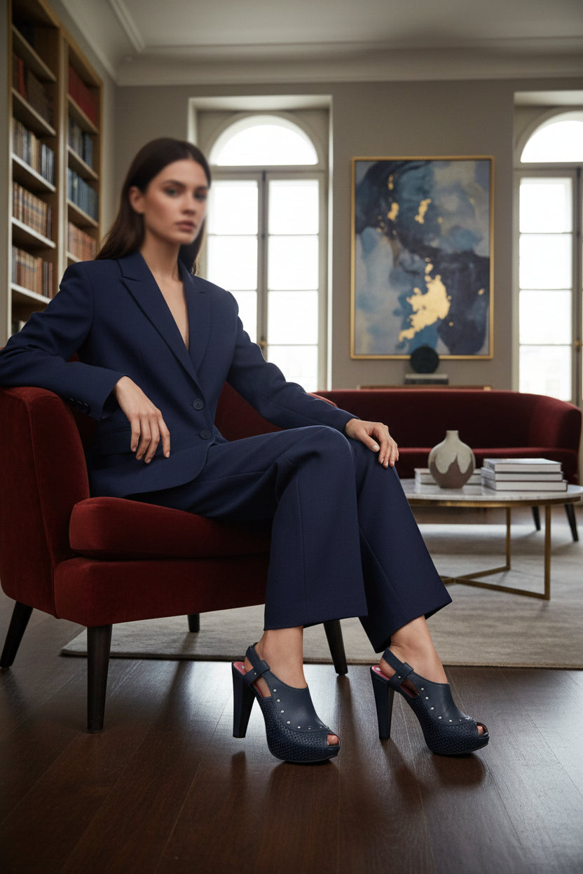 Elevate your silhouette with the Argente, a navy platform slingback that marries height with wearability. Standing at 7.5 inches, this heel delivers dramatic lift without sacrificing comfort—the generous platform eases the pitch, while supple leather uppers and linings cradle your foot in luxury. A refined slingback design keeps you secure through the day. Sophisticated, statement-making.
