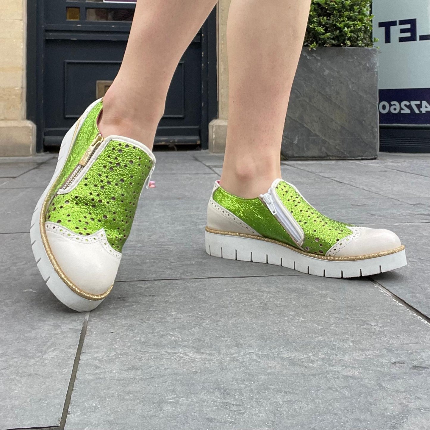 Zap's double zipper and perforated Lime green upper is a dazzling addition to the spectrum of spring colours. The gold glitter piping on the sole adds a sophisticated sheen to the design. Perfectly fitting to size, this sneaker ensures comfortable and relaxing wear for those with medium to wide feet, crafted from all-leather uppers and linings with a flexible white rubber sole.