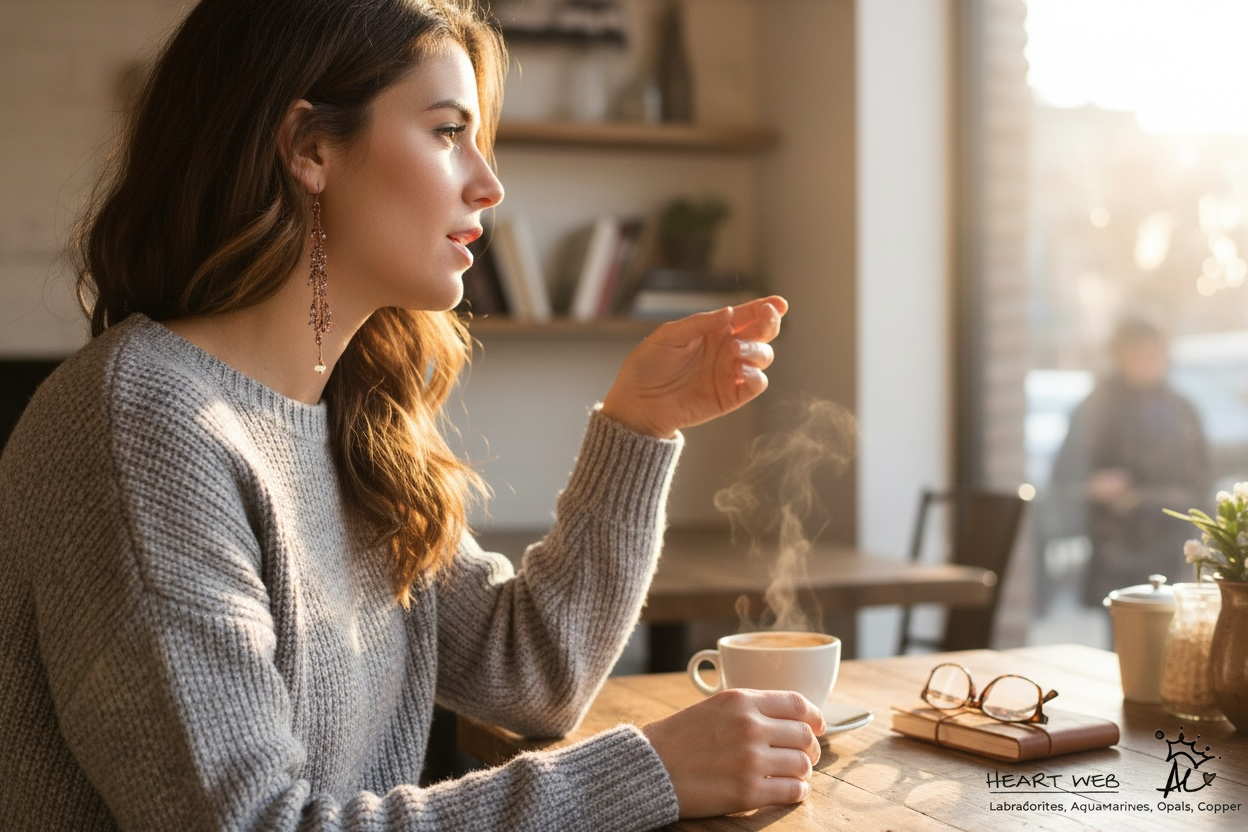 Pure copper earrings with raw jem stones of labradorites, aquamarines and yellow opals. hanging shaped hearts on the ends